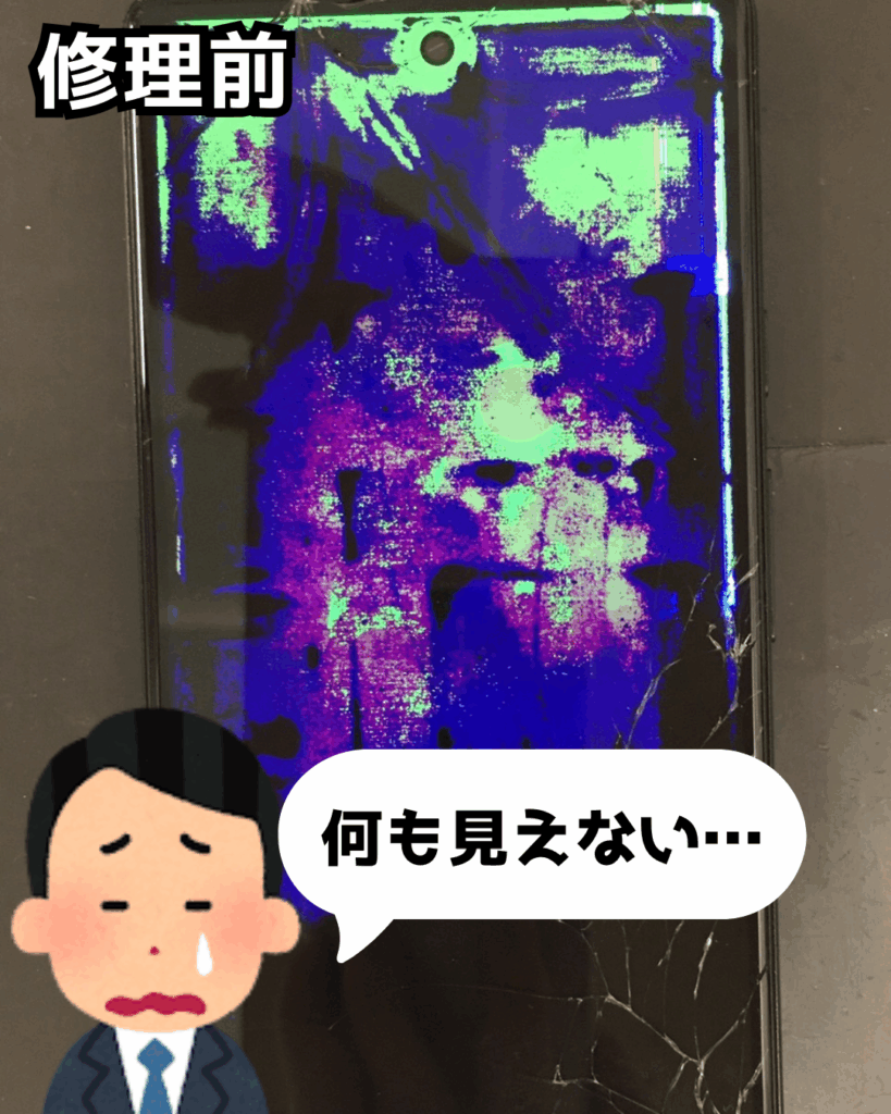 今回のように全く見えなくなっていても内部は正常に起動しており、画面交換のみで対応可能なケースは多いです。新品に買い替えるよりもお安く済みますし、データもそのままでお使いになれます。